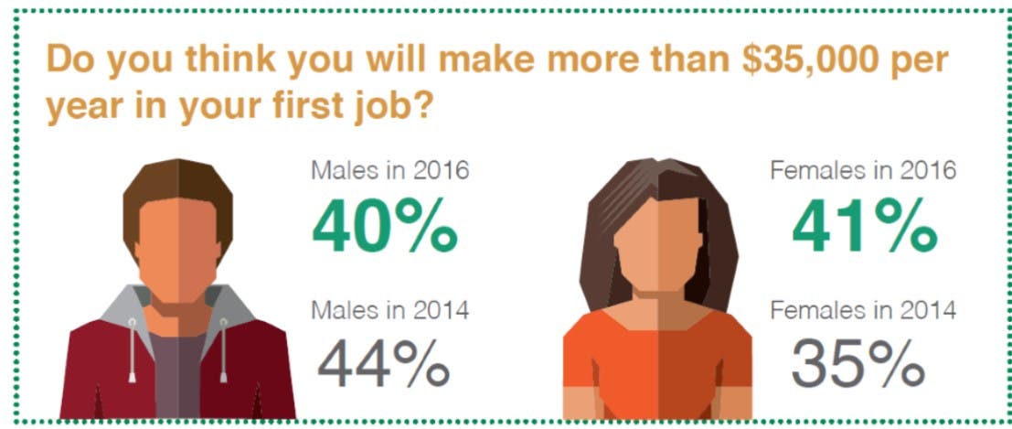 In 2014, Junior Achievement asked survey participants planning to go to college if they expected to make more than $35,000-a-year at their first job. In that survey, 44 percent of boys believed they would make more, compared to 35 percent of girls. In the 2016 survey, that numbers were virtually identical. (40% of boys; 41% of girls)
