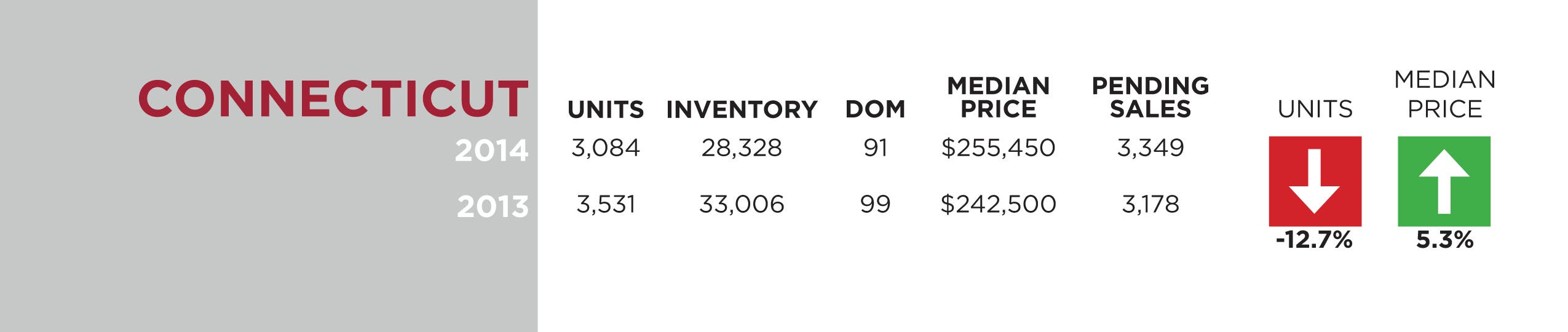 · In Connecticut, the number of total transactions is down -12.7% year-over-year and median price is up 5.3. Pending sales were up 5.4% year-over-year.