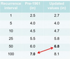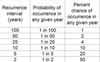 The answer to this question is based on historical data. Rainfall data for a particular site, and for a particular duration (such as 24 hours) are sorted, from highest to lowest. Then a calculation is performed to determine the chances of an event of any given size occurring. The recurrence interval is an estimate of the likelihood of an event, and is related to the probability. So as you can see from Table 1, there is only a 1% chance that a 100 year storm will occur in any given year.