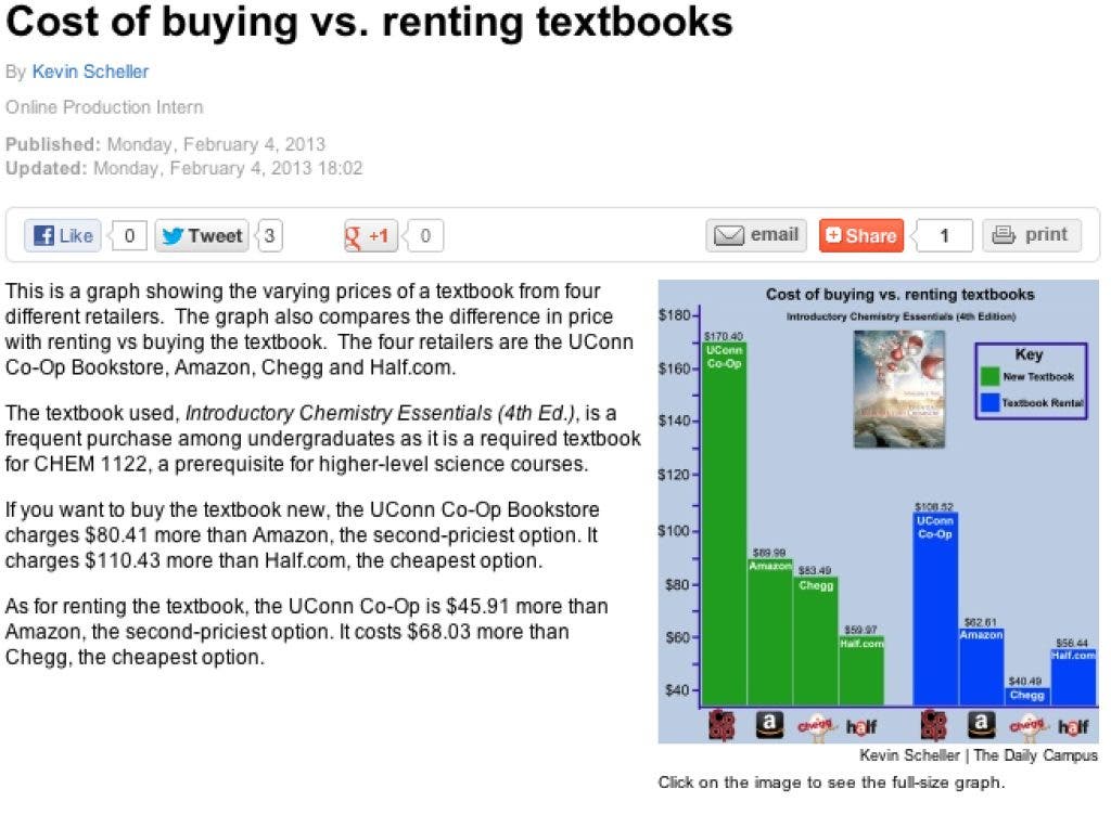 Our new online production intern, Kevin Scheller, who is also our photo editor, and I collaborated on the story “Cost of buying vs. renting textbooks,” which compares the two common ways students get books. It also compares the price of one textbook sold at the UConn Co-Op, our bookstore, and on other popular sites like Amazon.com and Half.com.