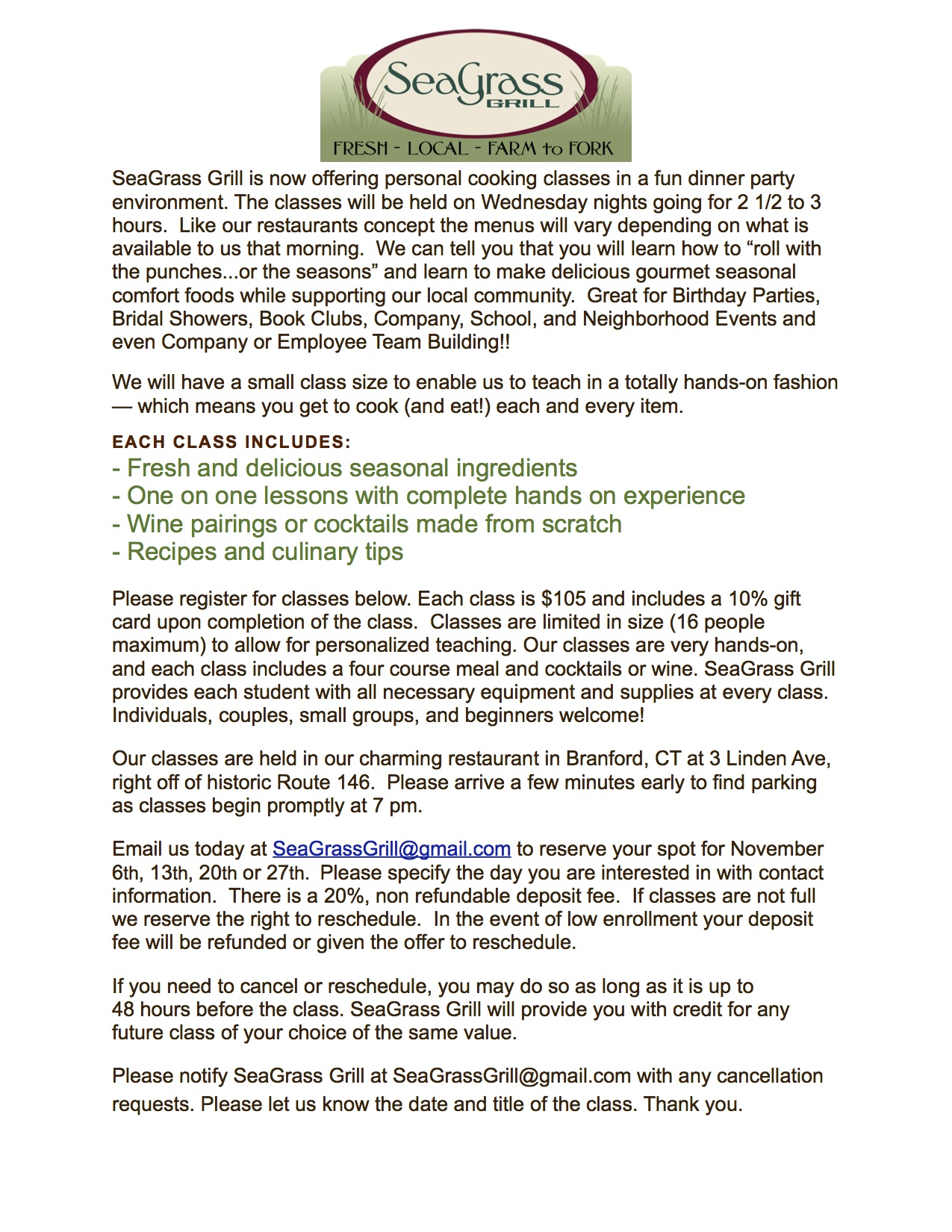 Starting the first week in November we will be offering Seasonal Cooking Classes every Wednesday night starting at 7pm. Book your classes now and be ready to have some fun!!
