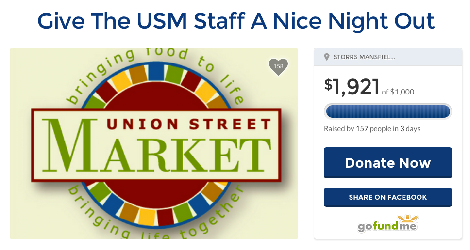 It seems that two students organized a GoFundMe campaign to raise money to to buy a gift certificate to treat the market workers to dinner at Geno’s Grille in Storrs Center.