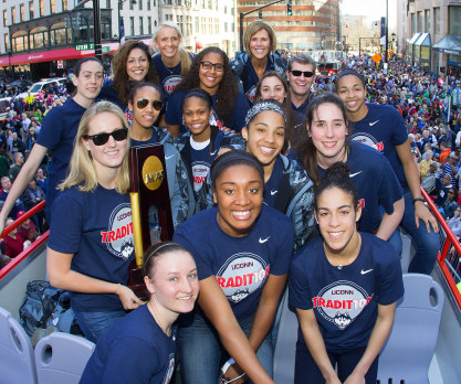 Photo: The 2015 UConn Lady Huskies basketball team during their victory parade. Credit UConnHuskies.com.