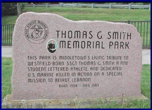 On Monday October 31st 1983 the Middletown Press ran an article, which read in part; “A local Marine who had been listed as missing in action in last week’s suicide bombing in Lebanon was officially listed as dead on Sunday. Staff Sgt. Thomas G. Smith, son of Mr. and Mrs. Joseph Smith of Footit Drive, is one of six Connecticut Marines reported killed in the attack on the Marine barracks in Beirut.”