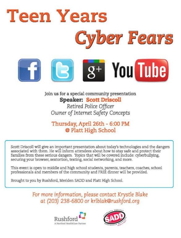 We hope that you will join us for this FREE educational forum which is being presented by Rushford, Meriden SADD (Students Against Destructive Decisions) and Platt High School. A light dinner will be provided. For more information please call Krystle Blake at Rushford at 203-238-6800.