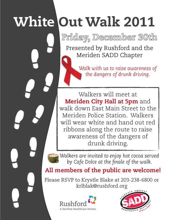 Meriden SADD (Students Against Destructive Decisions) and Rushford will conduct the Second Annual White Out Night on Friday December 30th beginning at Meriden City Hall at 5:00 pm.