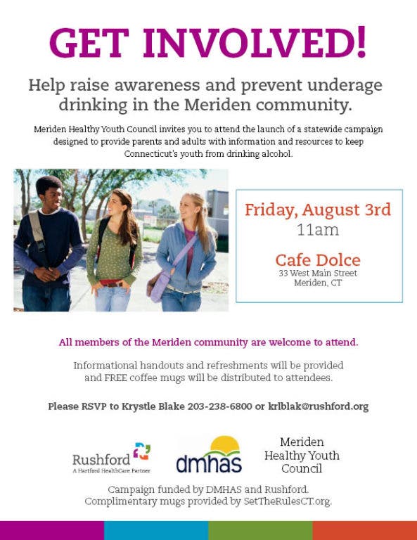The Meriden Healthy Youth Council, sponsored by Rushford is promoting the statewide media camping Set The Rules CT at a meeting Friday August 3rd at 11am at Cafe Dolce, downtown Meriden. The Healthy Youth Council is a partnership of parents, students, schools, police, and the community, working together to keep our children safe and drug free. Our goal is to create awareness in the community concerning substance abuse and to work together collaboratively to prevent and reduce drug and alcohol use and their related problems.