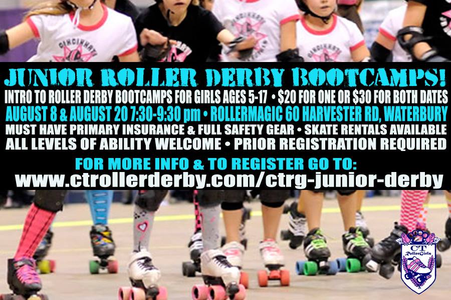 Our summer 2013 junior roller derby bootcamps will be held in Waterbury, CT on August 8th and August 20th from 7:30pm to 9:30pm.