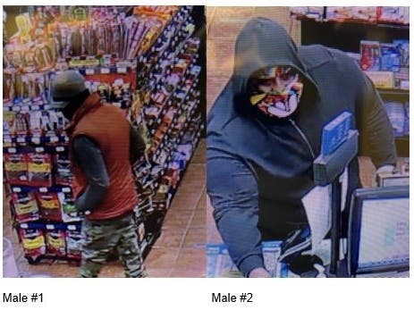 An undisclosed amount of money was taken. The first man police described as "light-skinned, possibly Hispanic, approximately 5’6” tall, wearing camouflage pants, a gray long sleeve sweater, with a red/orange vest over, a gray hat, and a black ski mask."