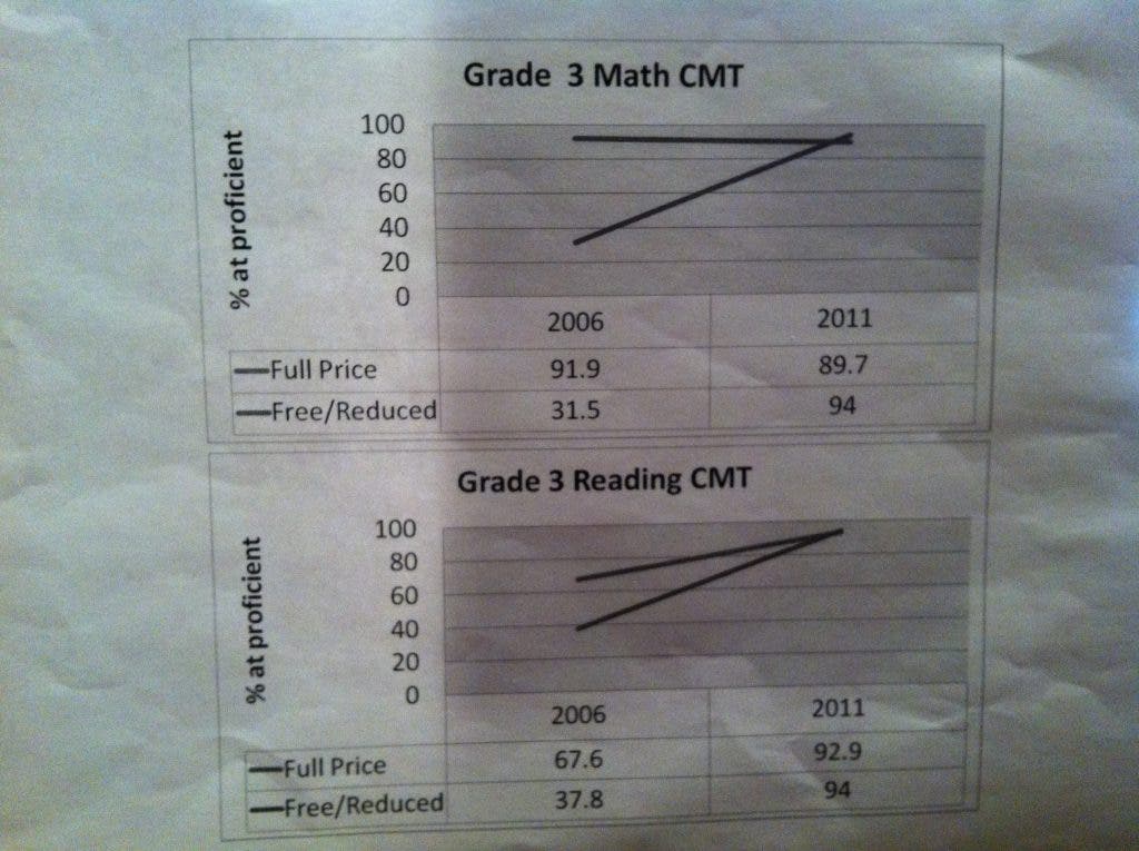 "My favorite chart," Quinn says pointing to the sheet, graphs the number of students at the Meriden school who achieved "proficient" scores on third grade math and reading Connecticut Mastery Tests over the last five years.