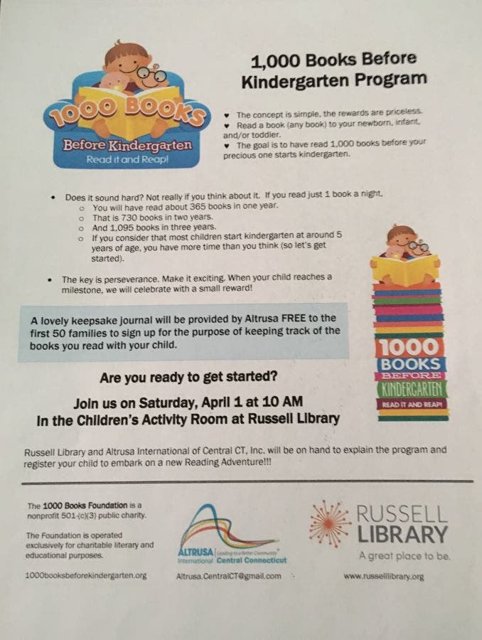 Altrusa International of Central CT and Russell Library are pleased to announce a jointly sponsored FREE. Reading program, 1000 Books Before Kindrtgarten. The concept is simple, the rewards are priceless. Read a book to your newborn, infant, and/or toddler; the goal is to read 1000 before your precious one starts Kindergarten.