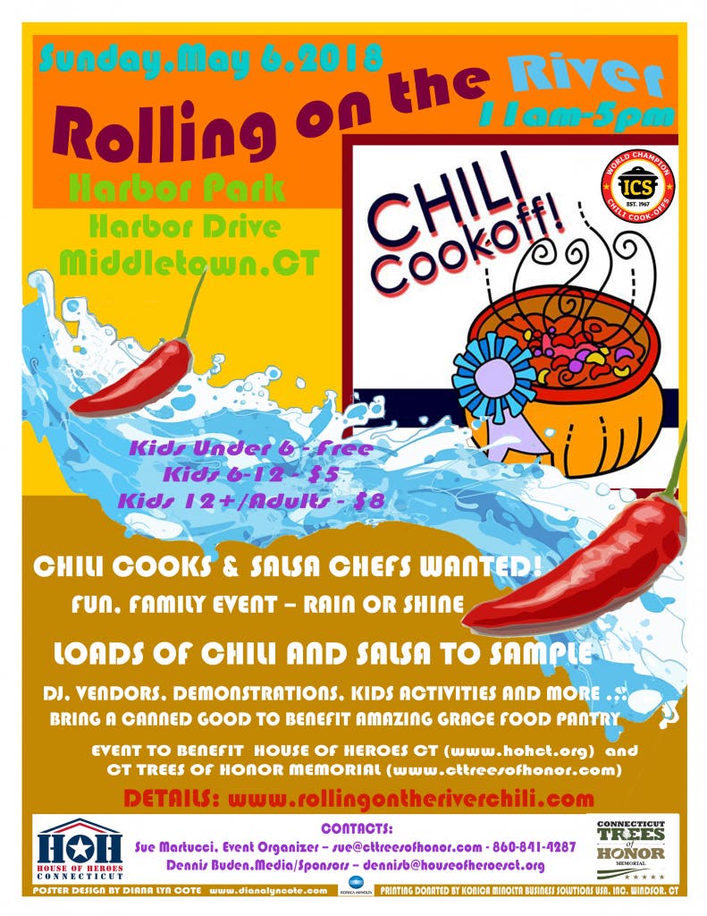 The first annual, Rolling on the River Chili Cook-Off an ICS (International Chili Society) sanctioned Cook-Off on the beautiful Connecticut River in Middletown, CT. Chili, chili, and more chili for you chili fans to sample and vote your favorite! Performances, demonstrations, music, DJ, kids’ booths, and more! Fun for the whole family – RAIN OR SHINE!