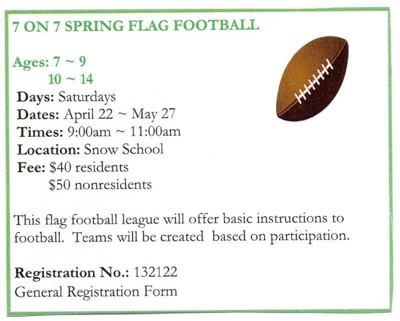 Arts & Entertainment7 On 7 Flag FootballSaturday's In April And MayBill Maune, Community ContributorPosted Wed, Mar 22, 2017 at 2:59 pm ET ShareJoin the conversation