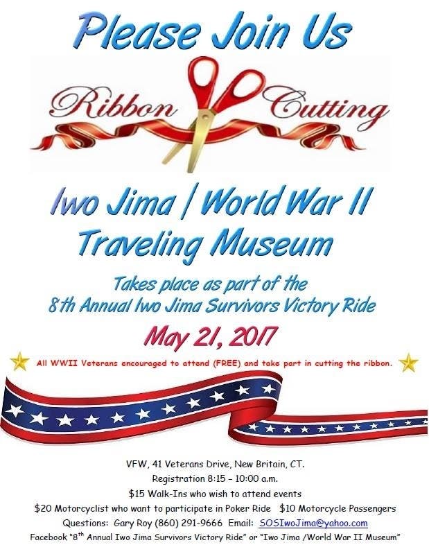 We are requesting your participation and sponsorship in order to make this possible for our “Greatest Generation”. Volunteers and Sponsors are needed so please contact us if you would like to help. Call Victory Ride Chairman, Gary Roy, at 860-291-9666 or email us at SOSIwoJima@yahoo.com. Look for upcoming ride details to be posted on our “8th Annual Iwo Jima Survivors Victory Ride” Facebook page.