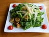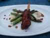 About ready to burst, but ready to tackle another plate, we savored the taste of an unlikely pair, rosemary and blueberry, in our next dish: salmon toasted in rice paper served over a blueberry and rosemary red wine sauce. Apprehensive how the strong flavors of rosemary and blueberry would mesh, we slowly forked small bite-fulls into our mouths. I was pleasantry surprised how well the rosemary complemented the blueberry and red wine reduction, while contrasting with the crispy crunch of the salmon's wrapping and cool cucumber chunks.