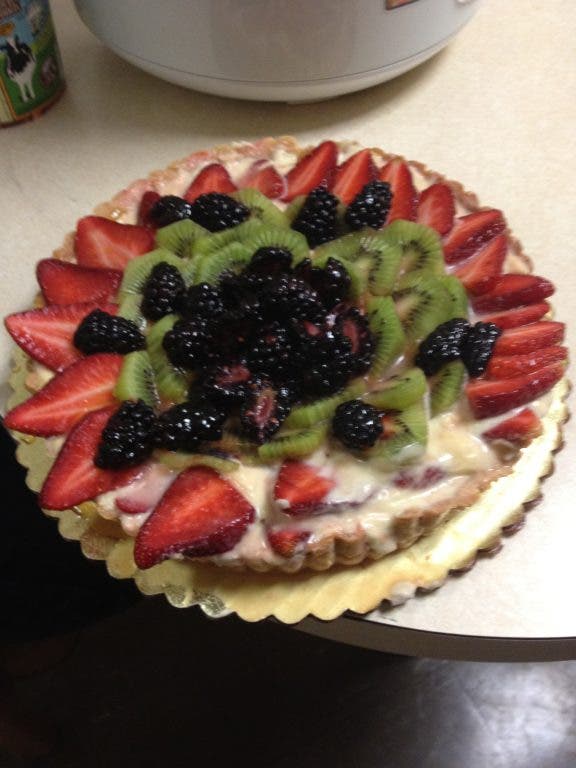 Sliding down ice-covered Church Street in 10 degree weather was no easy feat with a giant fruit tart in our hands, but it was definitely worth it. When we showed our friends the fruit tart–about a foot in diameter and gleaming with beauty–they were so excited that they started digging in before we had even eaten dinner. The custard was creamy and perfectly complemented the sweet variety of fruit: fresh blackberries, strawberries, and kiwi. The bottom was made out of a crunchy pie crust that was topped with a thin layer of hard white chocolate. Delicious, to say the least.