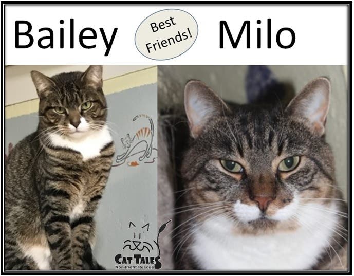 Hi, my name is Bailey, and my best friend in the world is Milo! We were both rescued off the streets of Middletown as strays. We came to Cat Tales about the same time and formed a wonderful bond together. Milo loves his belly rubbed more than I do, as I’m a bit more shy. However, I am fond of some of the volunteers and let them pet me. We are both very sweet kitties and would love to be adopted together. We dream of being on a sunny catio, where we can lay next to each other and soak up the warm rays! Milo is FIV+ but he’s a lover, not a fighter so it’s very difficult for other cats to catch it – we’d need to exchange blood. Milo has helped me come out of my shell at Cat Tales so I would love to spend my life with him, and with you! We would love to sit next to you while you’re watching TV, or snuggle up in your warm bed with you. Would you consider adopting us together? We promise to love you forever! Please take us home today!