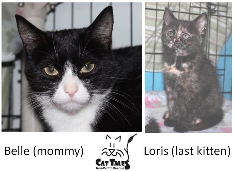 Hello, My name is Belle and I was found as a young pregnant stray by Cat Tales. And this is my last kitten left, Loris. We are hoping to get adopted together because we love each other very much. I’m a very good mommy and very protective over my babies. Loris is a very sweet little girl who loves to play although she can be shy at times. We both love to be petted and just crave attention as we’re both basically kittens! We can go home in June after our spays, hopefully together! Call or email Cat Tales to put down a deposit to hold us or come to meet us – ask for Belle & Loris. Please adopt us both today!