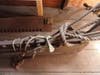 The two rusty iron cross-cut saws and pry bar, about four feet in length, were made by Bisston Philadelphia, USA. The horse-drawn plough still has its wooden yoke and heavy woven ropes.