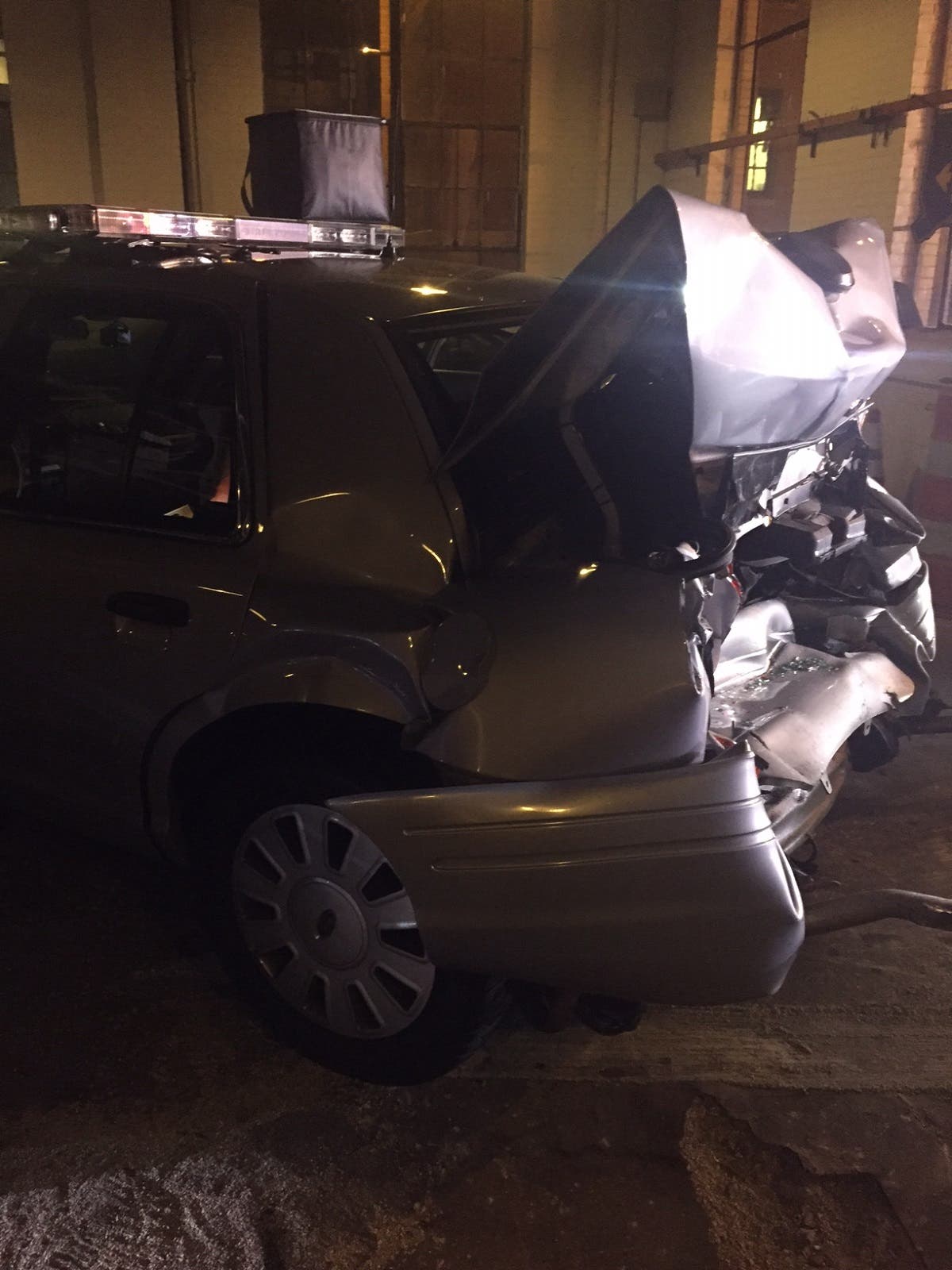 The police cruiser was parked in the left lane with its emergency lights on while DOT crews fixed a guardrail at time of the crash.