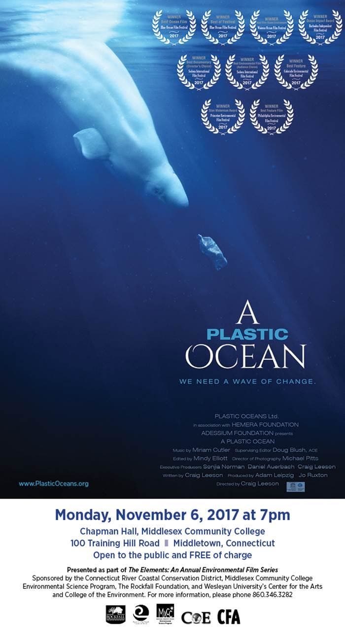 The next film in our series, The Elements: An Annual Environmental Film Series will be A Plastic Ocean, on Monday, November 6, 2017. The film will be shown at 7 pm at Chapman Hall on the campus of Middlesex Community College in Middletown (directions and public transportation). All films are open to the public and free of charge!