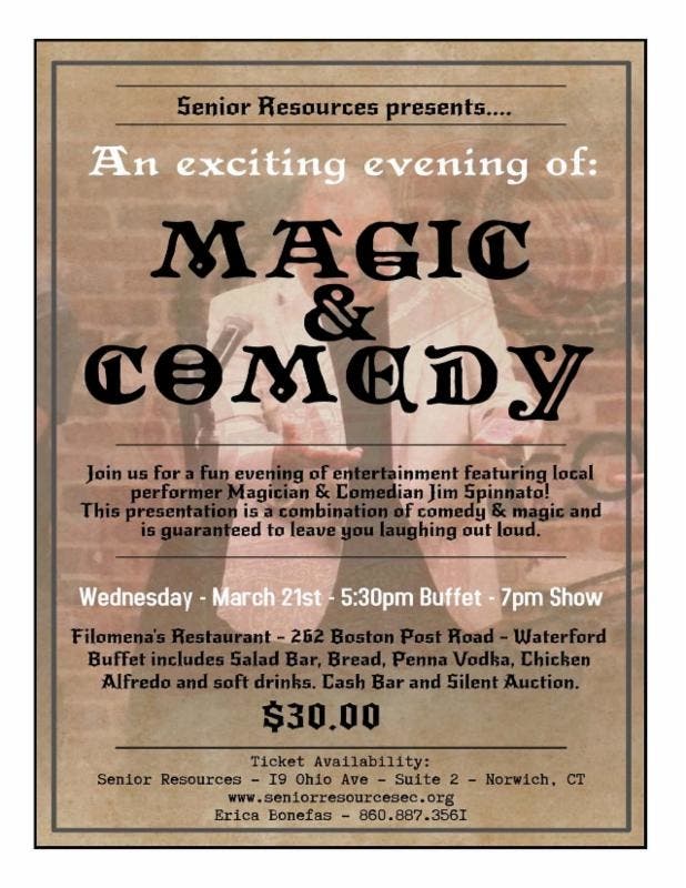 Come join Senior Resources and Jim Spinnato at Filomena's Restaurant in Waterford on March 21st for an evening of Magic & Comedy! Doors will open at 5:30 pm, a dinner buffet is already included in your ticket cost! There will be a silent auction with some fantastic items and the show begins at 7PM!