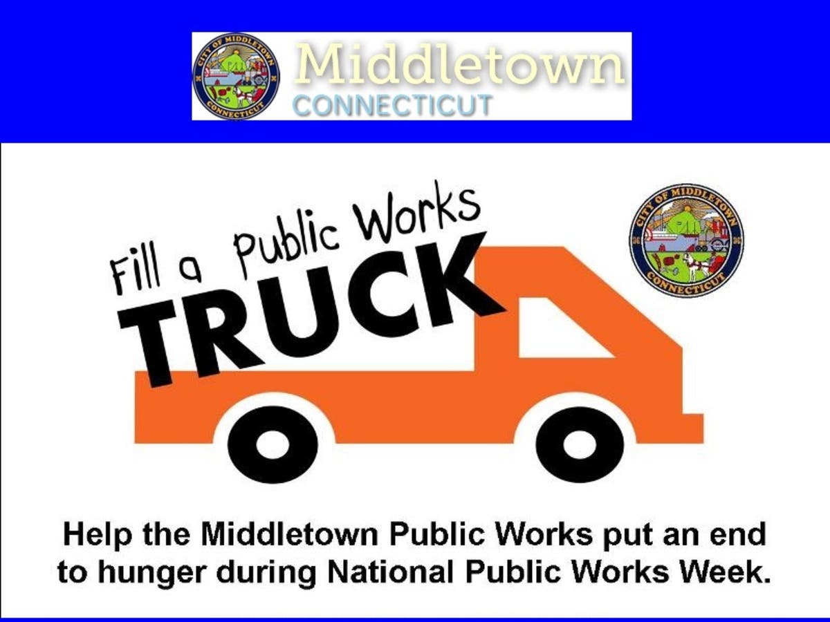 The City of Middletown is joining hundreds of Public Works Departments across New England to collect food and household goods to support our local community food bank needs. Middletown’s Fill-A-Public Works Truck Food Drive will be occurring during National Public Works Week, from May 20-26, 2018 and will support Amazing Grace Food Pantry.