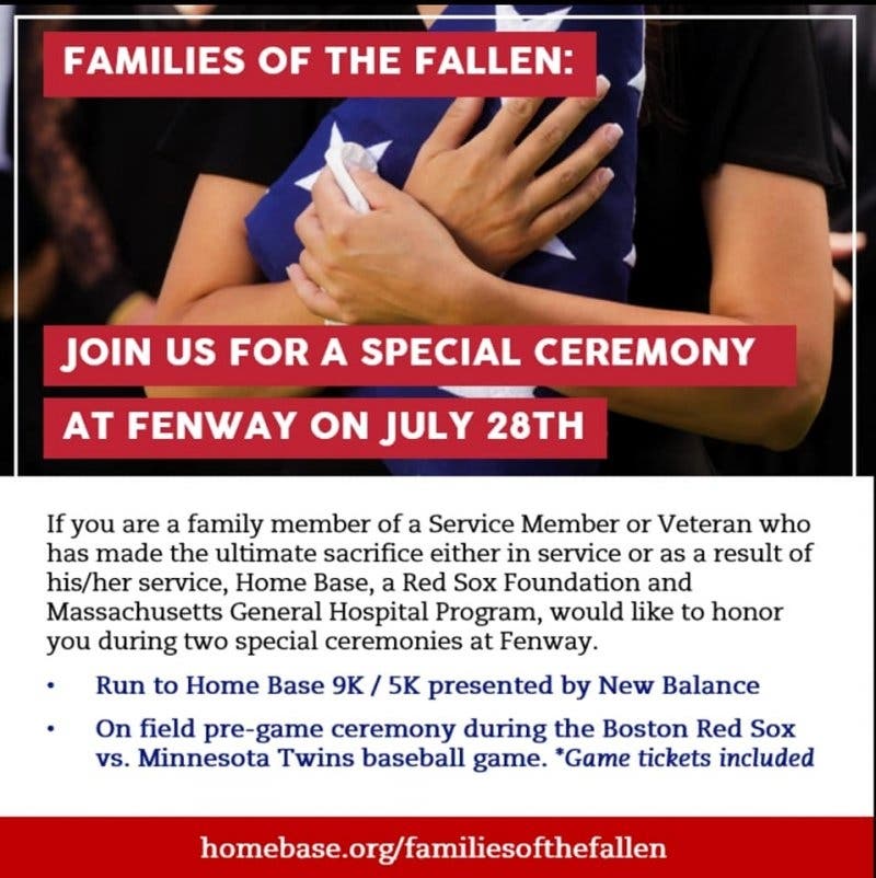 On Saturday, July 28th, Home Base, a Red Sox Foundation and Massachusetts General Hospital Program and the Boston Red Sox will honor the surviving families of fallen Service Members and Veterans with a special tribute at the 9th annual Run to Home Base presented by New Balance charity race and during the on-field pre-game ceremony of the Boston Red Sox vs. Minnesota Twins game that evening.