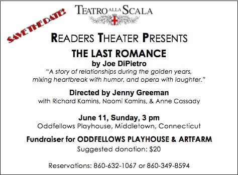 Please join us on Sunday June 11th for a special performance of THE LAST ROMANCE by Joe DiPietro. This delightfully amusing little play centers around three elders whose lives intersect one day in a dog walking park. Directed by Jenny Greeman, the cast features Richard Kamins, Naomi Kamins, and Anne Cassady. Proceeds from the performance will go to Artfarm and Oddfellows Playhouse. Reserve your seats today by calling 860-632-1067. We hope you can attend this very special event!
