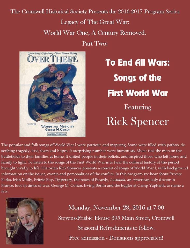 Cromwell Historical Society, next Monday, the 28th at 7 at the Stevens-Frisbie House at 395 Main Street in Cromwell. Rick Spencer will be singing songs from World War I.