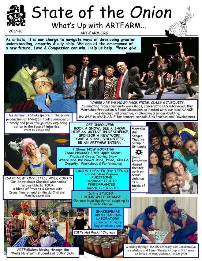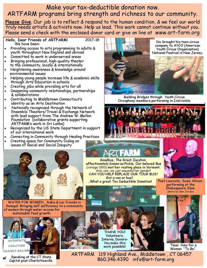 Please consider making a tax-deductible year end donation by clicking HERE or by sending a check to ARTFARM, 119 Highland Ave., Middletown, CT 06457. In case you missed it in November, our 2017- 2018 newsletter (The State of the Onion) is pasted in below.
