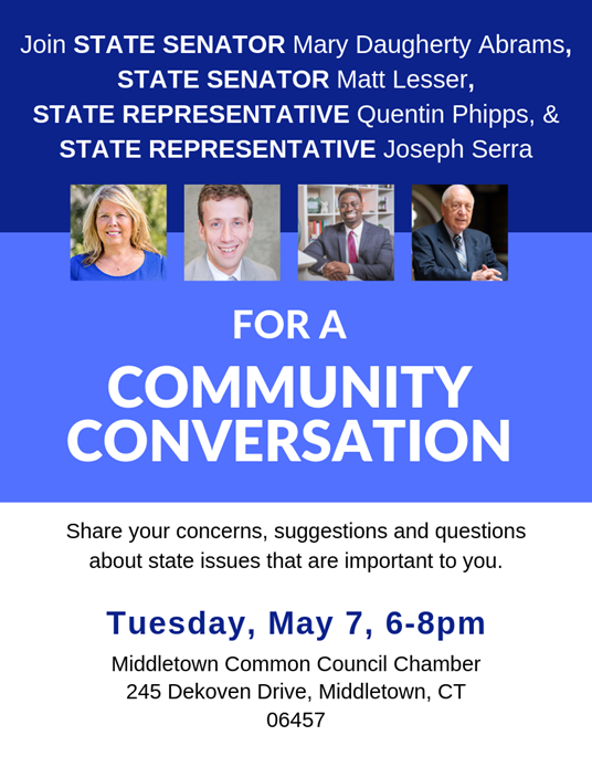 Please join me tonight for a community conversation with state Representatives Quentin Phipps, Joseph Serra, and state Senator Mary Daugherty Abrams from 6 pm-8 pm at the Middletown Common Council Chamber (245 Dekoven Drive). We are looking forward to answering your questions, hearing your concerns and holding an informative discussion on issues that matter most to you. All in the 9th District are welcome!