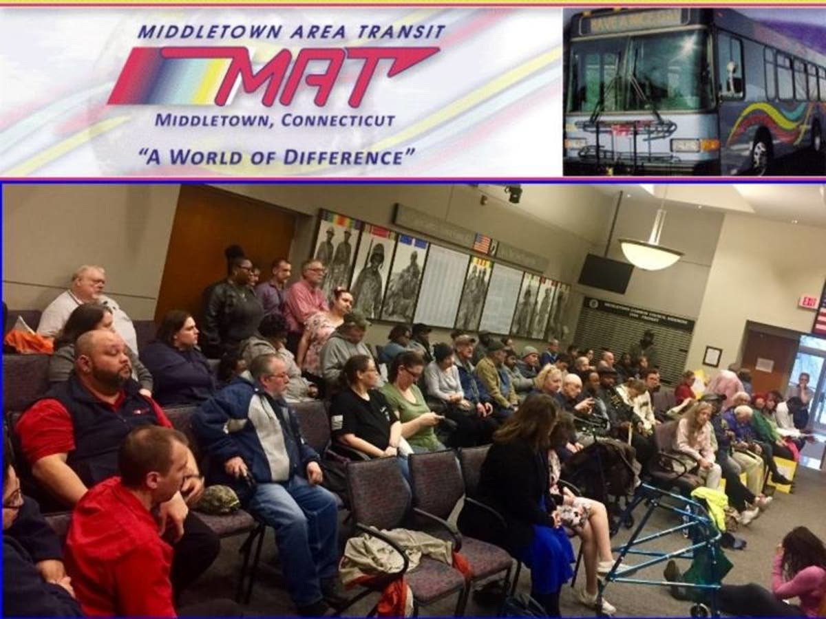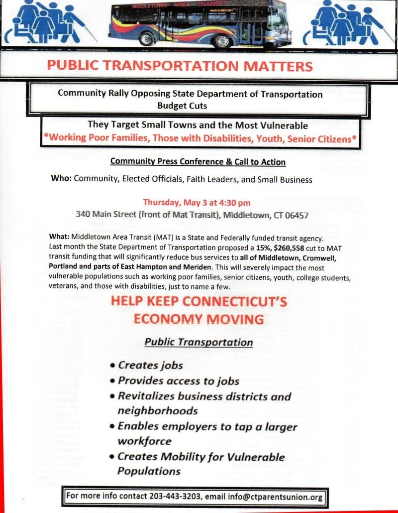 Last month the State Department of Transportation with, a state bus budget of over 156 Million, proposed a 15%, $260,558 cut to MAT transit funding that will significantly reduce and eliminate some bus services to all of Middletown, Cromwell, Portland and parts of East Hampton and Meriden. This will severely impact the most vulnerable populations such as working poor families, senior citizens, youth, college students, veterans, and those with disabilities, just to name a few.