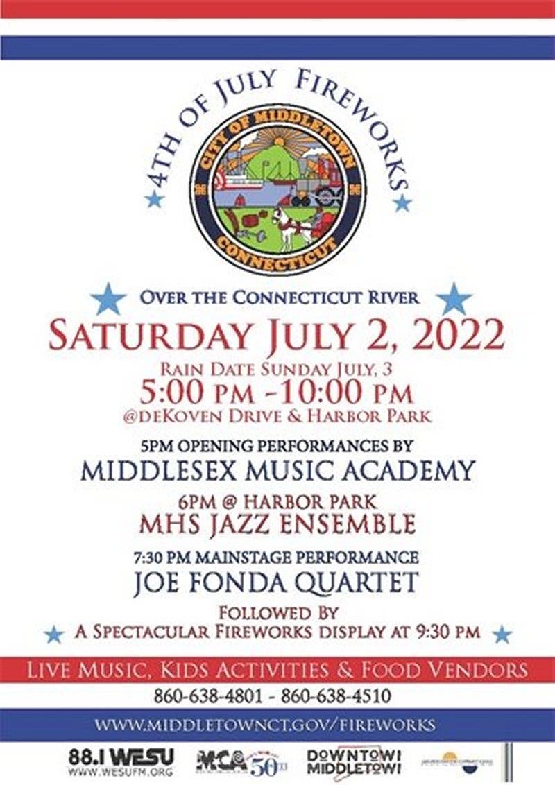 The City of Middletown will present the annual Fireworks Festival on Saturday, July 2, 2022, with a rain date of July 3. The festival will take place along the Connecticut River at Harbor Park, and on the front lawn of the City’s Municipal Building located at 245 DeKoven Drive. The festival showcase will present a dazzling fireworks display that is set off directly from a barge on the Connecticut River.