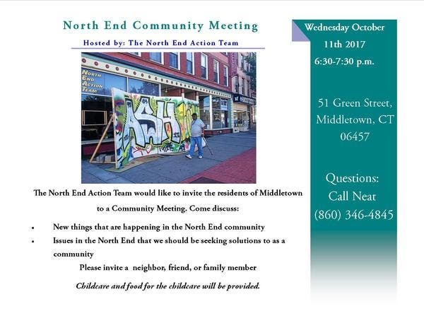 Come out for the North End Community Meeting! Wednesday, October 11, 2017 6:30-7:30pm Green Street Teaching & Learning Center.