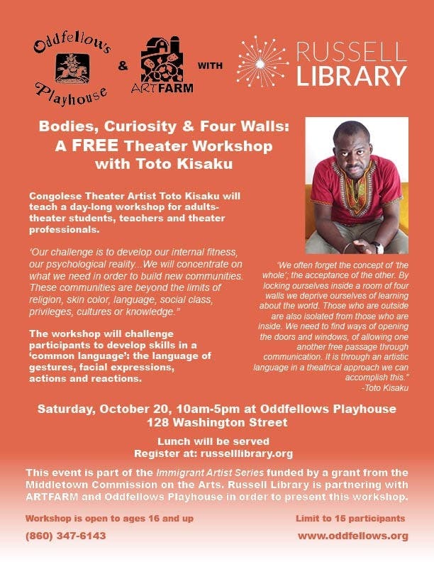 There are still a few places left in the theater workshop with Congolese actor/director/writer Toto Kisaku tomorrow, Saturday October 20th. It's free, and you even get a free lunch. Thanks, Middletown Commission on the Arts! Adults only (ages 16 and up). Register at the Russell Library website: www.russelllibrary.org.