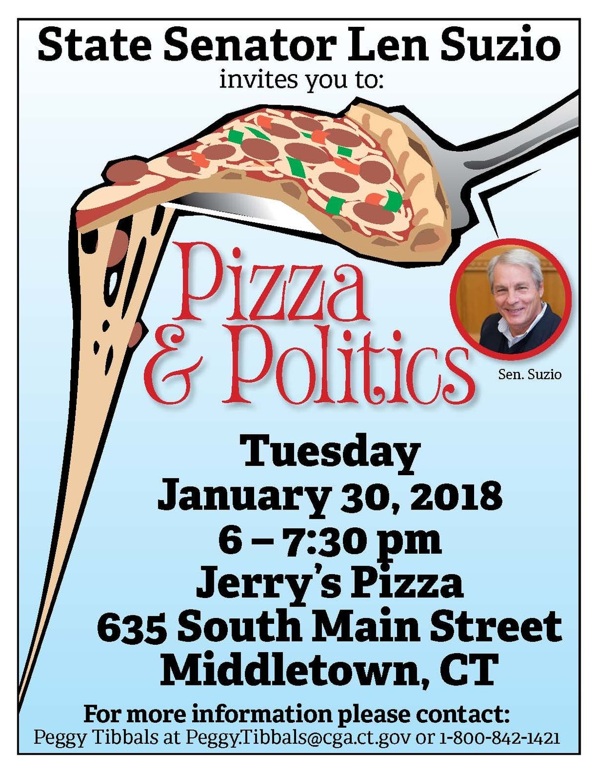 Politics & GovernmentSen. Suzio - Pizza and PoliticsJan. 30th at Jerry's PizzaBill Maune, Community ContributorPosted Sun, Jan 28, 2018 at 8:51 pm ET ShareJoin the conversation