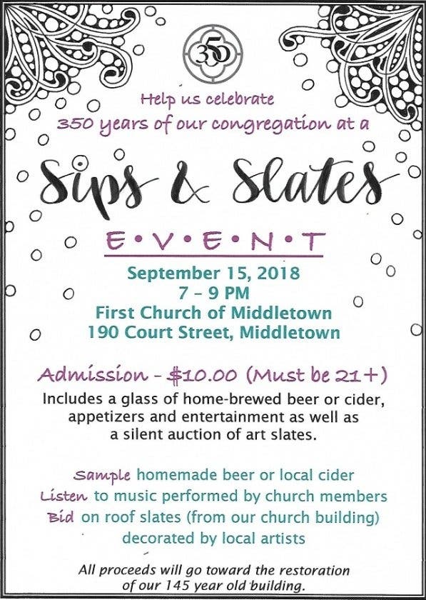 The "slates" are roof slates from our 145 year old building that have been decorated with original art by many members of our congregation as well as a few artists from the community. They will be sold at a silent auction. See the poster above for more details. If you plan on attending, please Click To RSVP! It will help with our food planning too.Please invite a few friends for this fun event! Hope to see you there!