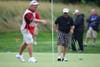 Unfortunately for the players and fans, thunderstorms limited play to nine holes, with the afternoon group teeing off two hours behind schedule. Two-time British Open champion Padraig Harrington's team won the event with a 10-under-par 25.