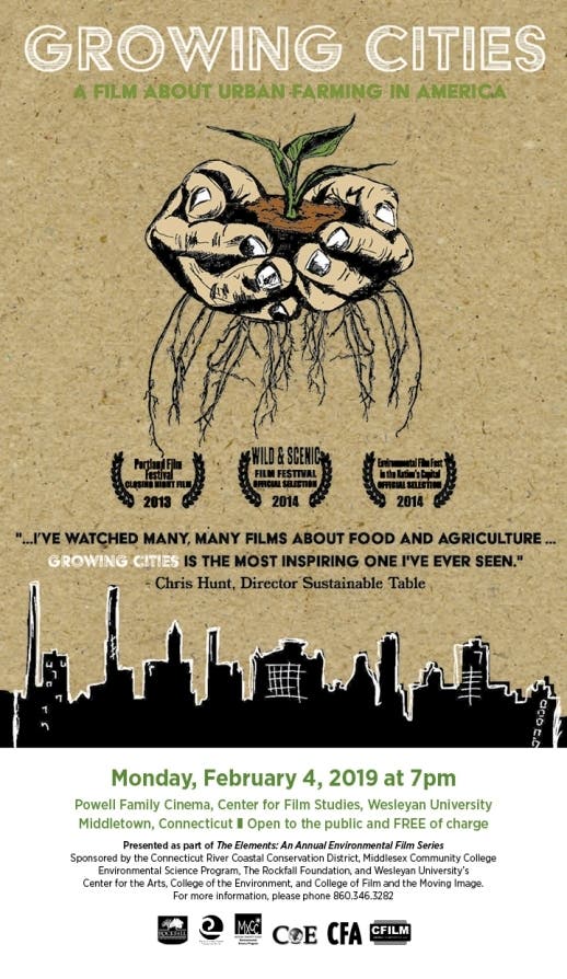 The next film in The Elements: An Annual Environmental Film Series will be Growing Cities. The screening will be held Monday, February 4, 2019 at 7pm at Wesleyan's Center for Film Studies, 301 Washington Terrace, Middletown, CT. Parking information and directions can be found here. As always, the film is open to the public and free of charge.