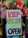 Workers at a substance abuse treatment program at CVH gathered Wednesday to protest the state's plan to cut a large portion of the program.