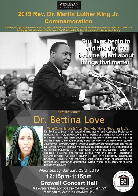 Dr. Love's talk is entitled “What Came Before & After King: Abolitionist Teaching & Life," and will focus on the struggles and the possibilities of committing ourselves to an abolitionist goal of educational freedom, as opposed to reform, and moving beyond what she calls the educational survival complex. Abolitionist Teaching is built on the creativity, imagination, boldness, ingenuity, and rebellious spirit and methods of abolitionists to demand and fight for an educational system where all students are thriving, not simply surviving.