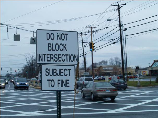 Boston Post Road and its intersections with Cedarhurst Lane and East Town Road have signs posted advising motorists that blocking the intersection is prohibited and violators are subject to a $117 fine.