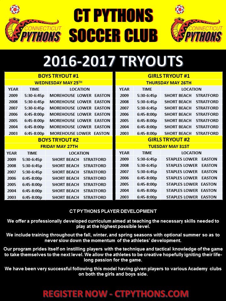 The Connecticut Pythons Premier Youth Soccer Team is hosting open tryouts for the 2016/17 season.