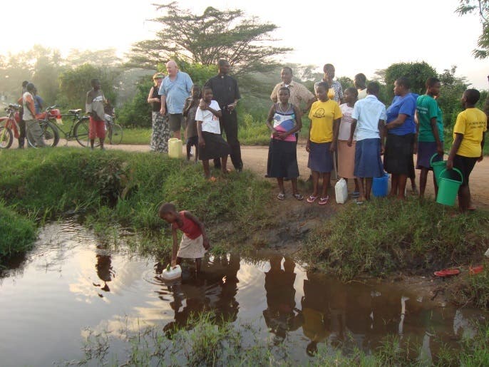 Right: Holler and Marecki watch as water is fetched in 2012 from Lake George in Ihunga, Uganda, before the water project was completed.