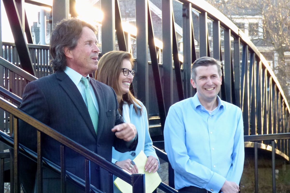 Rich Smith (left), chairman of the Milford Democratic Town Committee, and Gayle Slossberg (center), Democratic state senator from the 14th district, address the crowd prior to James Maroney(right) announcing his candidacy for state senate Monday at Founders’ Walk in Milford.
