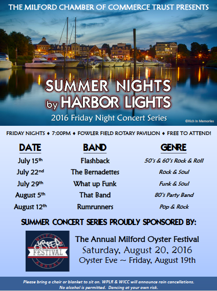 The Milford Chamber of Commerce Concert Series 'Summer Nights by Harbor Lights' presents the 'What Up Funk Band' on July 29.