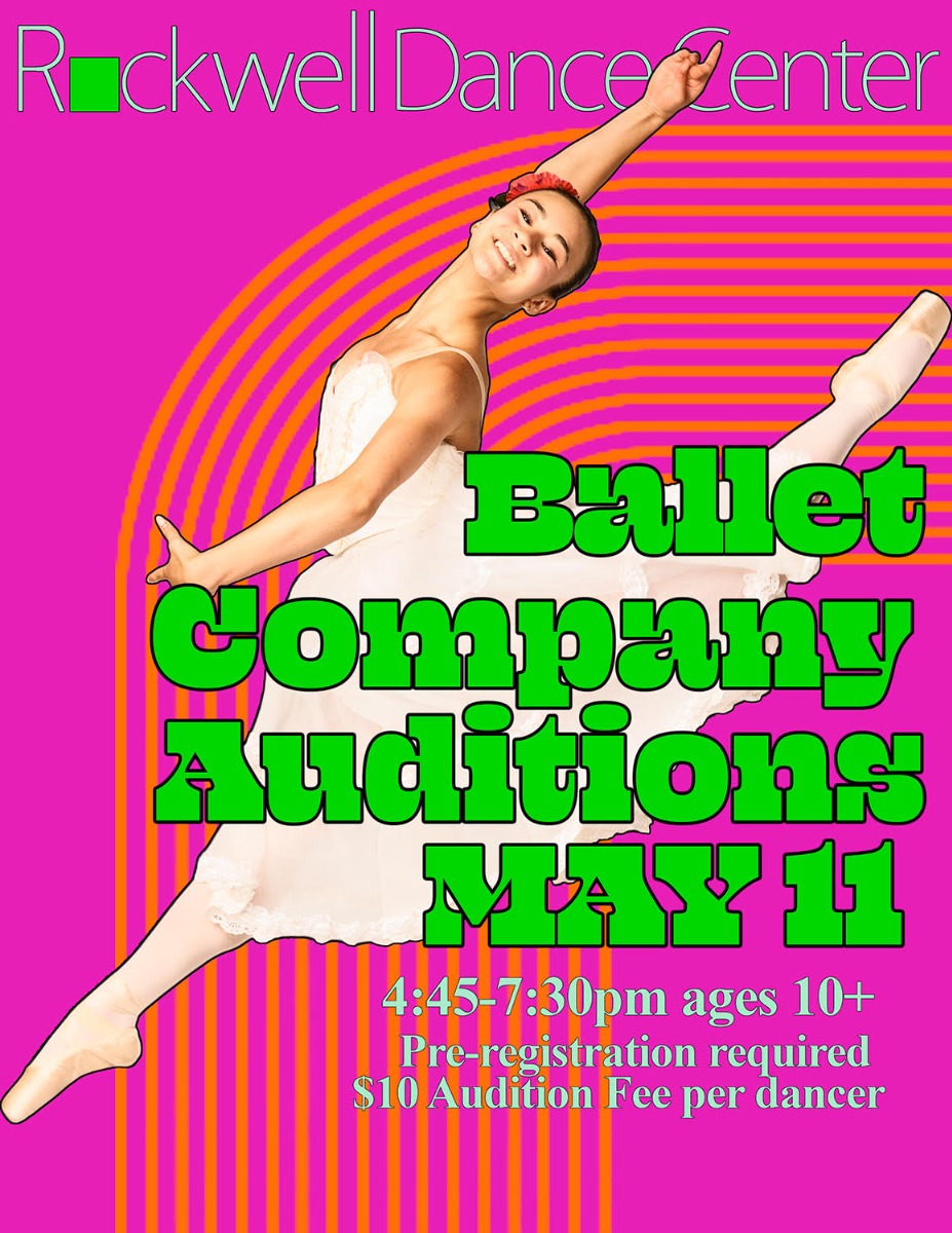 Rockwell Dance Center invites you to AUDITION for their Ballet Company and Scholarships on Monday, May 11th, 4:45-7:30pm. Audition Fee of $10 - Pre Registration is required. This audition will be adjudicated by an outside professional. Ages 10 and Up - bring pointe shoes if applicable. For more information call 203-502-8315.