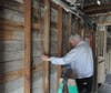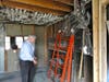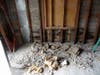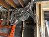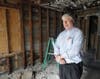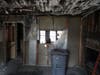 Plaster walls have come down, showing the naked, uninsulated boards beneath. Ductwork, some damaged by the heat from the fire, dangles from the ceiling.