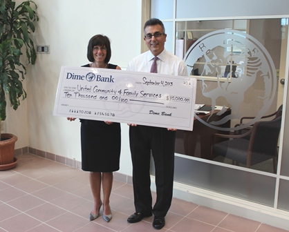 Dime Bank recently awarded United Community Families & Services (UCFS) with a check for $10,000 toward their Capital Campaign which will fund the final phase of the construction project. The Edward and Mary Lord Foundation will match the donation; so, the donation will now total $20,000. According to Chuck Seeman, President/CEO, “I would like to thank Dime Bank for their generous donation of $10,000 to the expansion/renovation project at the Edward and Mary Lord Family Health Center at UCFS. Dime’s commitment to the health and well-being of our region is evident through its support of community organizations such as UCFS.”